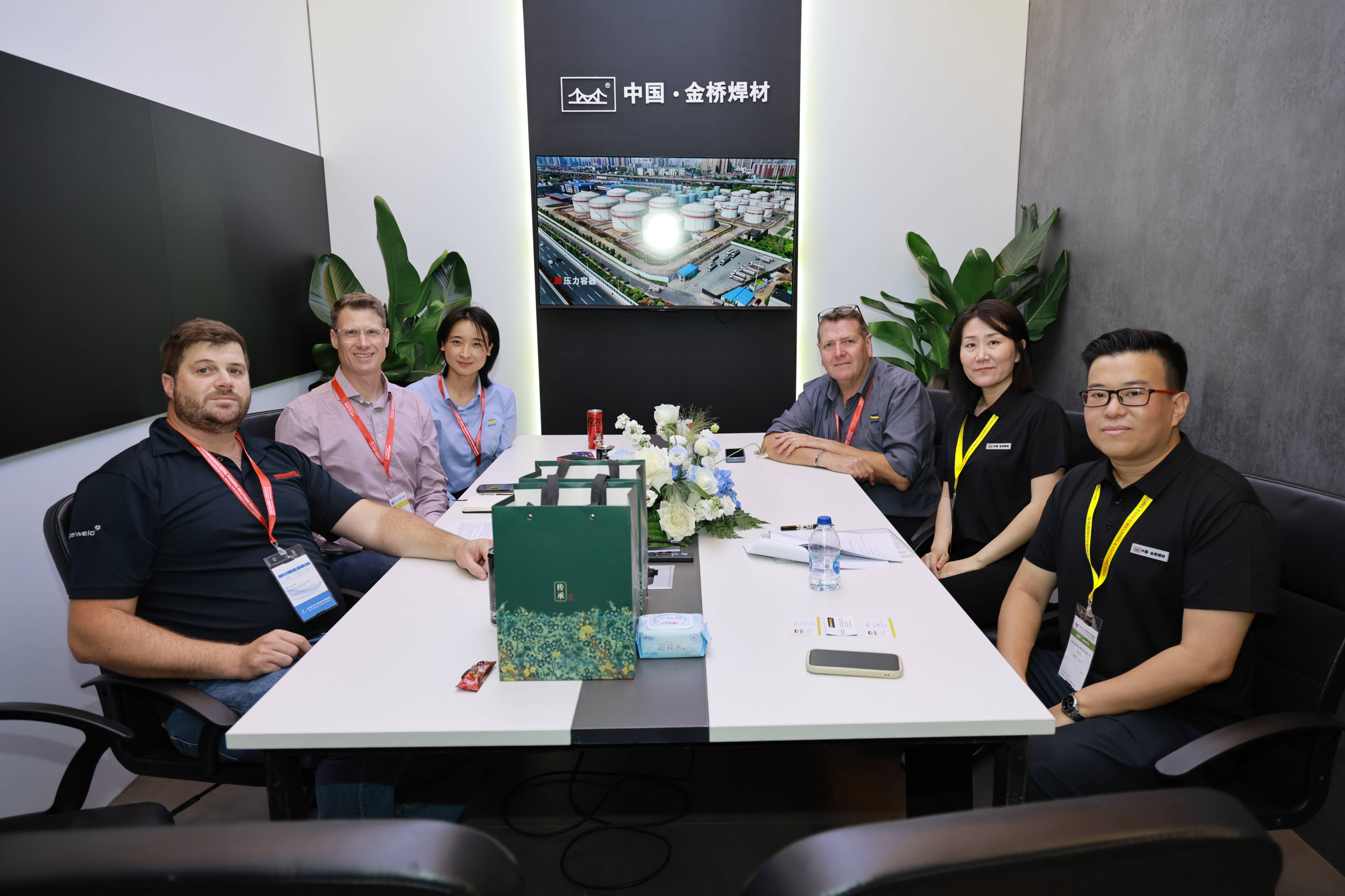 四大行業(yè)展示區(qū)、試焊區(qū)和焊件展示區(qū)人流如織,熱鬧非凡。現(xiàn)場客戶咨詢了高強(qiáng)鋼焊接工藝涵蓋的方面及熔斷效果、成型效果,鋁合金雙脈沖工藝在汽車底盤等方面的應(yīng)用等情況。船舶行業(yè)客戶詢問了JQ.YJ503MX-1高效金屬粉芯型藥芯焊絲的產(chǎn)品情況,對產(chǎn)品性能和價格進(jìn)行了接洽溝通,約定后期可進(jìn)行試用。家電行業(yè)客戶咨詢了銀釬料產(chǎn)品,表示后續(xù)會大力跟進(jìn)開發(fā),集團(tuán)將根據(jù)客戶需求進(jìn)行工藝改善與優(yōu)化。來自巴西的國際客戶詢問了無鍍銅實(shí)心焊絲產(chǎn)品,并對集團(tuán)高端藥芯焊絲產(chǎn)品密切關(guān)注,表現(xiàn)出進(jìn)一步合作意向。來自斯洛伐克的老客戶詢問了高端實(shí)心焊絲、藥芯焊絲產(chǎn)品及金橋“焊接一體化”服務(wù),表示會繼續(xù)加強(qiáng)合作,促進(jìn)與金橋焊材的合作共贏。