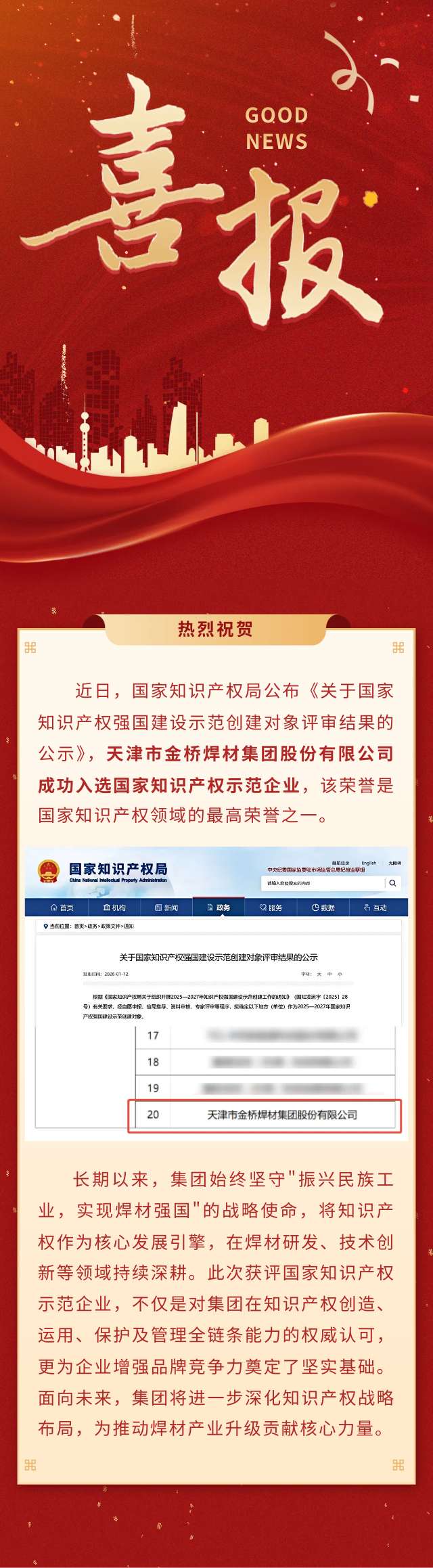 喜報!金橋焊材集團成功入選國家知識產(chǎn)權(quán)示范企業(yè)創(chuàng)建對象