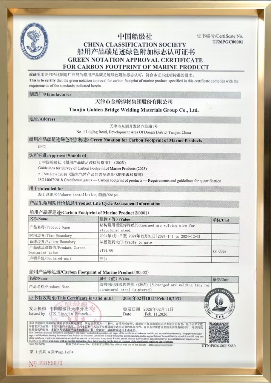 金橋焊材集團(tuán)榮獲國內(nèi)焊材行業(yè)首個(gè)船用產(chǎn)品碳足跡綠色附加標(biāo)志認(rèn)可證書